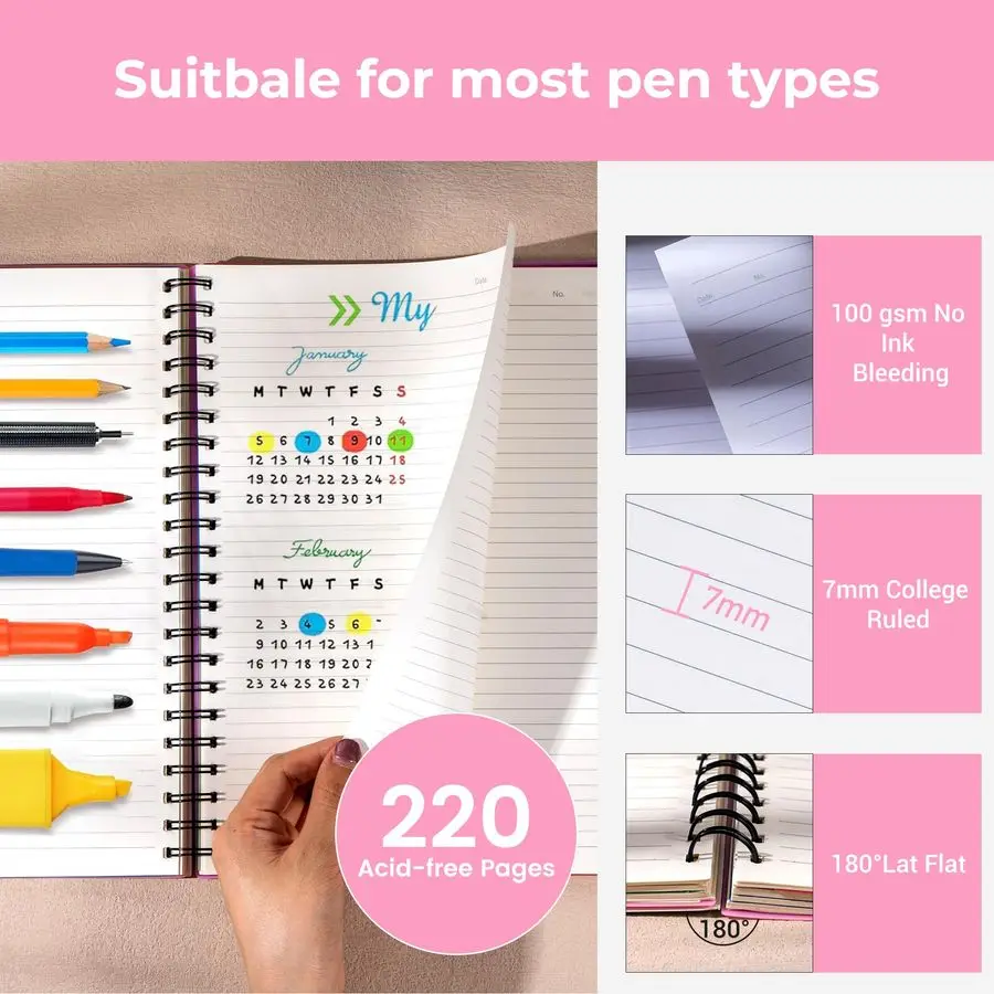Durable Waterproof Cover Pink notebook cover is made of premium plastic material, waterproof and durable. Hardcover notebooks compared to ordinary paper covers, spiral notebooks can prevent coffee or water from wetting the inner pages and protect your important meeting records or school notes. Wonderful work or school supplies